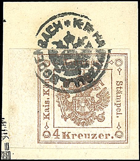 1858 - 4 kr. bruno, I tipo (4) Eccezionale con grosso b.f. a sinistra - Cert. Ferchenbauer (5.250,00++)