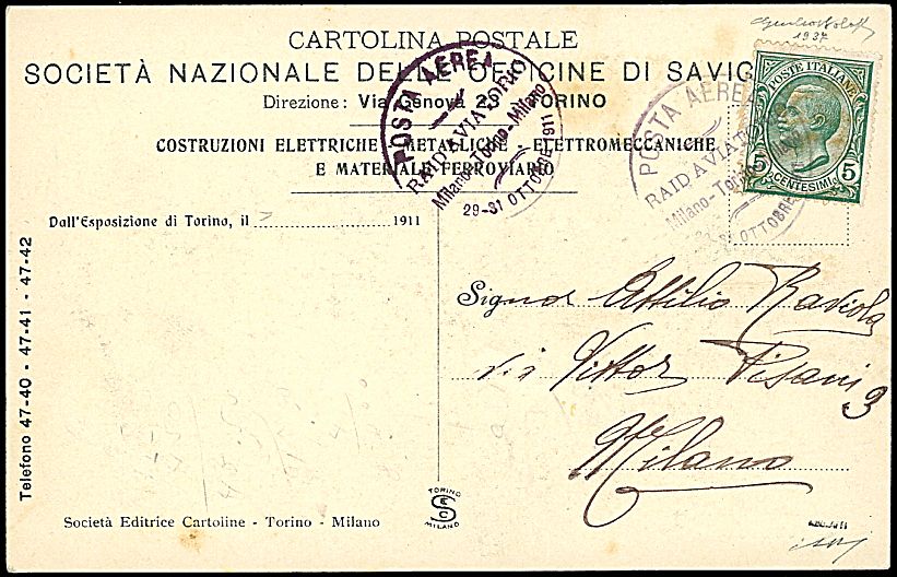 1911 - Torino - Milano / Raid Aviatorio - Cartolina con annullo speciale per Milano - Sigla G. Bolaffi (Longhi 550)