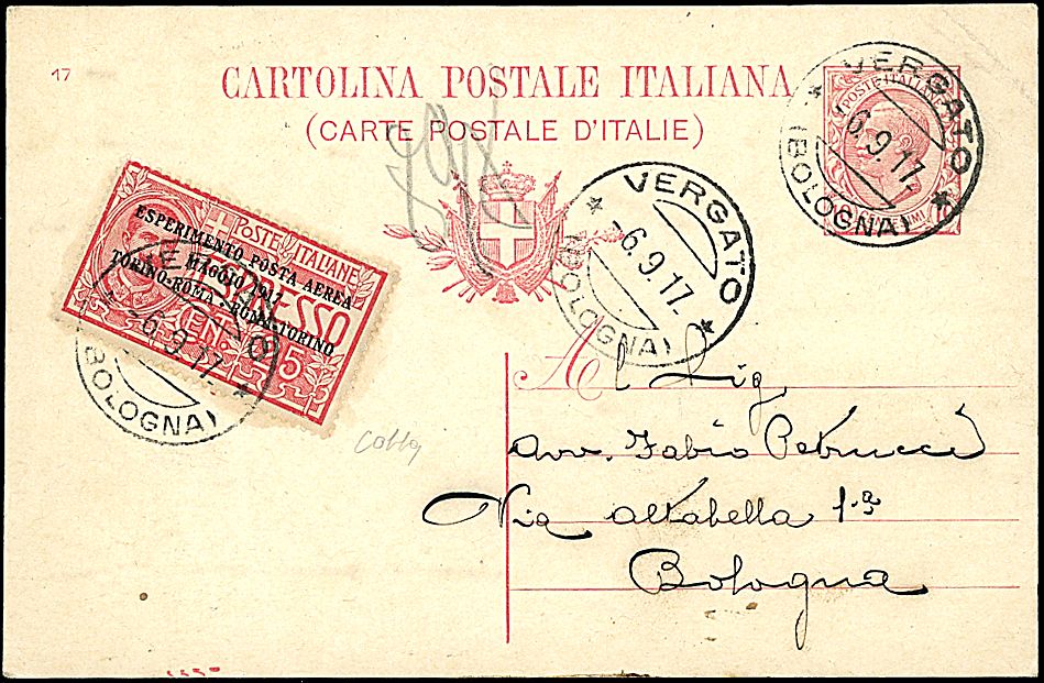 1917 - Cartolina postale espresso da 10 c. da Vergato (6/9/17) a Bologna, con affrancatura complementare impropria da 25 c. rosso (PA1) - Rarissima cartolina, solo altri due casi simili! - Cert. Colla