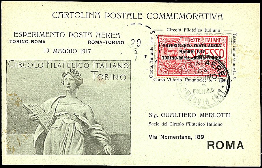 1917 - Volo Torino - Roma - Cartolina verde affrancata con 25 c. rosso (1) da Torino (20/5/17) a Roma (Longhi 798)