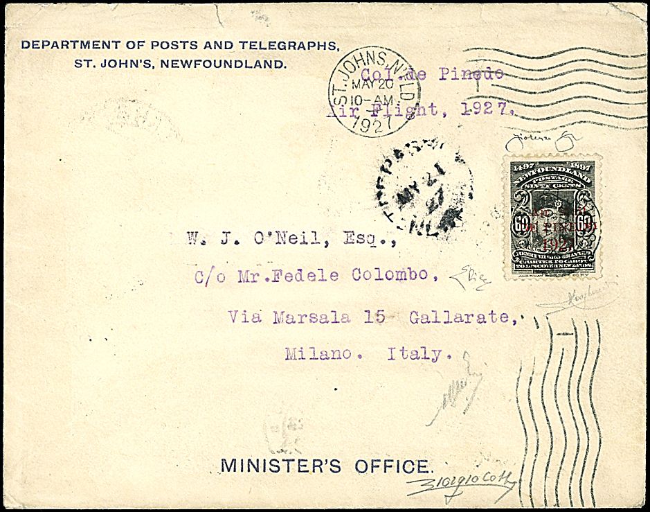 1927 - De Pinedo - TERRANOVA - 60 c. nero con soprastampa rossa AIR MAIL DE PINEDO 1927 su aerogramma da St. John (20/5/27) a Gallarate, via Roma - Interessante notare che il francobollo fu annullato con bollo a datario anzichè dalle linee ondulate - Rarissimo! - Splendida qualità - Cert. E. Diena + cert. Colla entrambi per esteso + cert. Toselli 100% (Longhi 1641 nota)