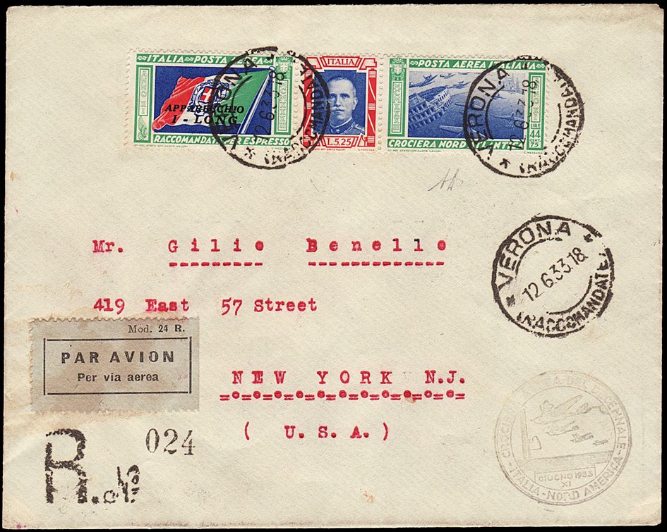 1933 - Trittico I-LONG da L. 50 (52I) SPl su aerogramma da Verona (12/6/33) a New York - Sigla AD (Longhi 2860)