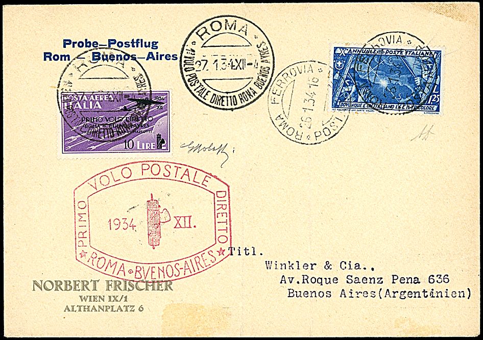 1934 - Roma - Buenos Aires - L. 10 violetto (59) su aerogramma da Roma (26/1/34) a Buenos Aires - Sigle G. Bolaffi + AD (1.100,00)