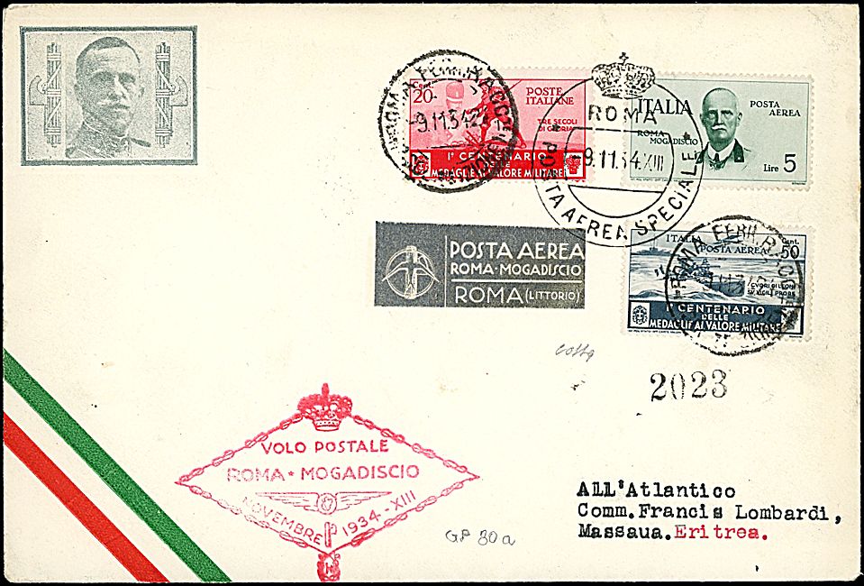 1934 - Roma - Mogadiscio - L. 5 verde (86) su busta da Roma (9/11/34) a Massaua - Bollo di arrivo - Sigla Colla (Longhi 3191)