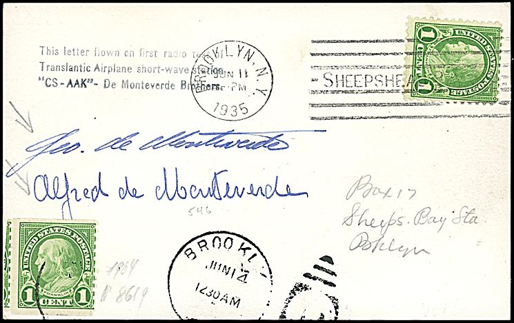 1935 - New York-Roma - Volo senza scalo F.lli Monteverde - Volo di prova della radio - Firme autografe dei piloti - Non comune (Longhi 3285)
