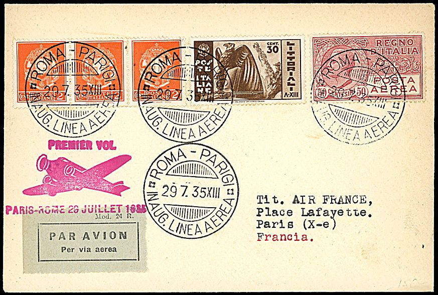 1935 - Volo Roma - Parigi - Busta da Roma (29/7/35) a Parigi - Bollo di arrivo (Longhi 3296)