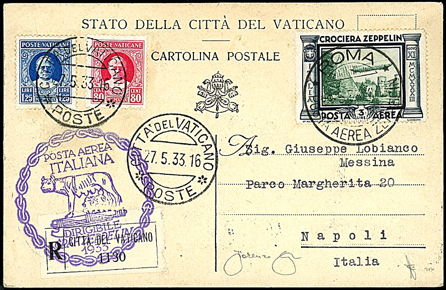 1933 - Volo di ritorno - Lancio su Nettuno - Cartolina con affrancatura mista dalla Cittā del Vaticano (27/5/33) a Napoli - Bollo di arrivo - Fotografata sul catalogo Longhi a pag. 193 - Cert. FL (Longhi 716)