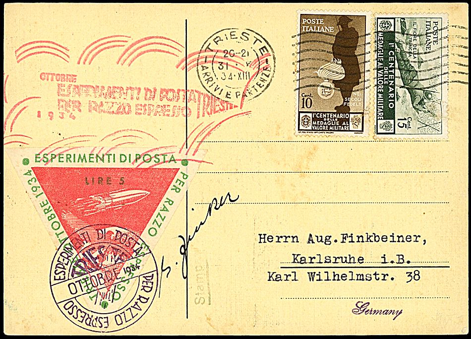 1934 - Cartolina affrancata con Medaglie 10 c. bruno + 15 c. verde + 1 etichetta Per razzo espresso da L. 5 - Sigla Longhi (Longhi 3175)
