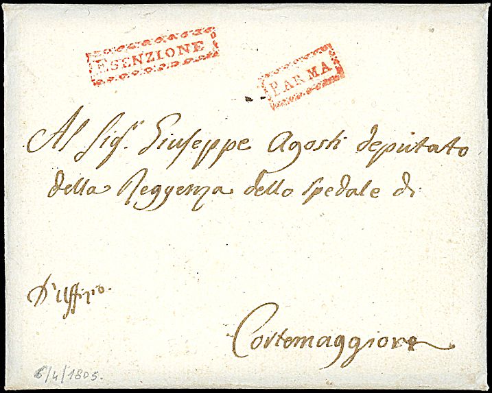 1805 - Lettera cpl. di testo da PARMA + ESENZIONE in rosso (6/4/1805) a Cartemaggiore - Eccezionale qualità!
