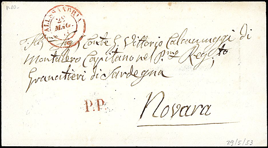 1853 - Busta da Alessandria + PP in rosso (22/5/53) a Novara