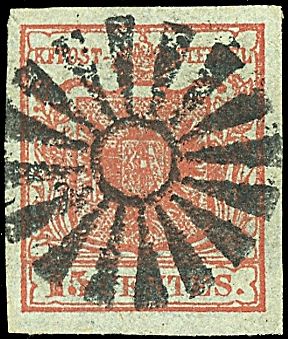 1850 - 15 c. rosso, I tipo (3) SPL con annullo muto di Milano (p. R3) - Raro - Cert. Ferchenbauer (15.000,00)