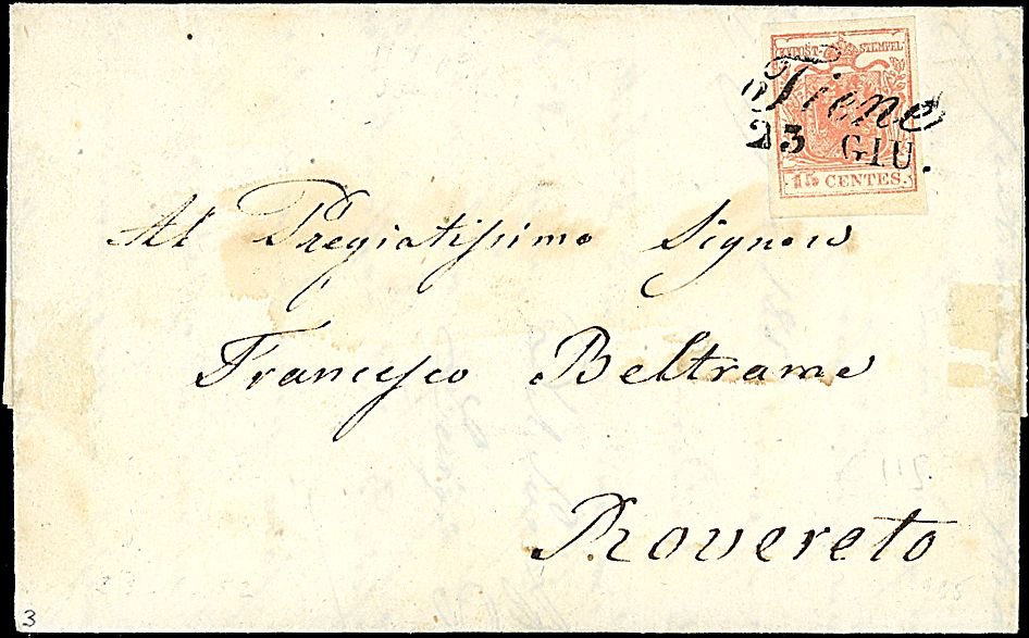 1850 - 15 c. rosso, I tipo (3) SPL su lettera da Tiene (23/6 - p. 5) a Rovereto