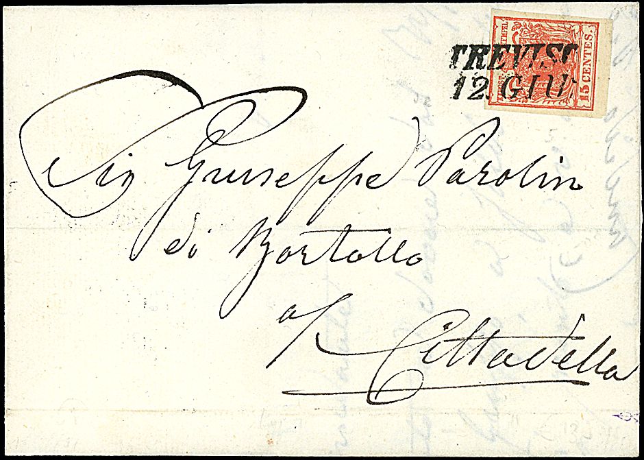 1852 - 15 c. rosso vermiglio intenso (3g) SPL su lettera da TREVISO 12 GIU (p. 1) a Cittadella