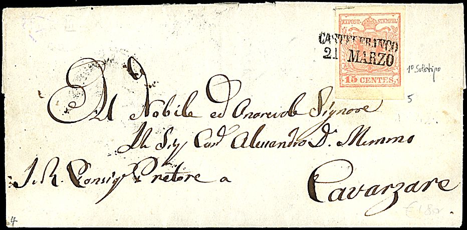 1850 - 15 c. rosa, II tipo (5) SPL su lettera da CASTELFRANCO (21 MARZO - p. 4) a Cavarzere (320,00)