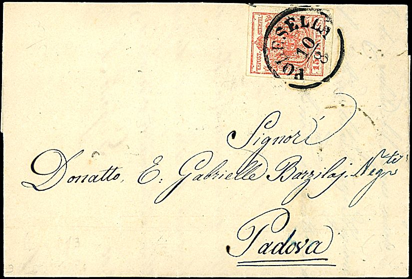 1850 - 15 c. rosso carminio, III tipo (6i) SPL su lettera da POLESELLA (10/8 - p. 3) a Padova