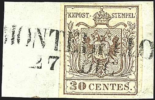 1853 - 30 c. bruno, I tipo (7) SPL su frammento annullato MONTEBELLO (p. 11 - 1.250,00)