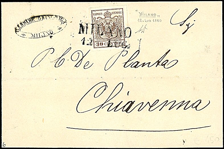 1850 - 30 c. bruno chiaro, I tir. (7a) SPL su lettera da MILANO (13/7/50 - p.. 6) a Chiavenna (875,00)