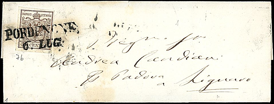 1850 - 30 c. bruno, I tir. (7b) SPL su lettera da PORDENONE (6 LUG) a Padova