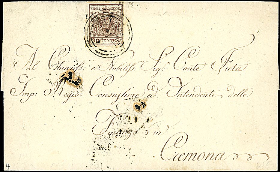 1853 - 30 c. bruno scuro, II tipo (8) SPL su lettera da VILLAFRANCA (21/4 - p. 4) a Cremona