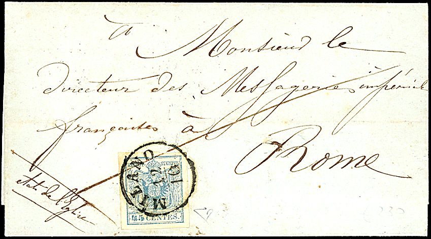 1852 - 45 c. azzurro ardesia, II tipo (11) SPL su lettera da MILANO (12/10) a Roma - Sigla ED (475,00)