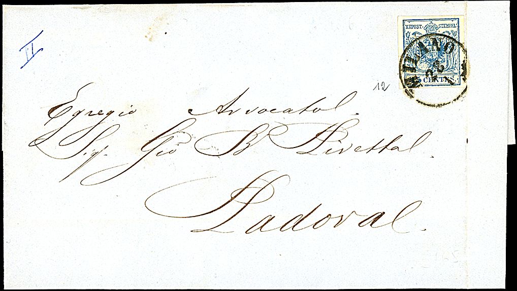 1852 - 45 c. azzurro, III tipo (11) SPL su lettera da MILANO (28/1) a Padova (400,00)