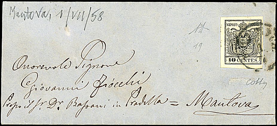 1854 - 10 c. nero, carta a macchina (19) SPL, isolato su lettera da Mantova (1/7/58) per cittā - Cert. Colla (3.000,00)