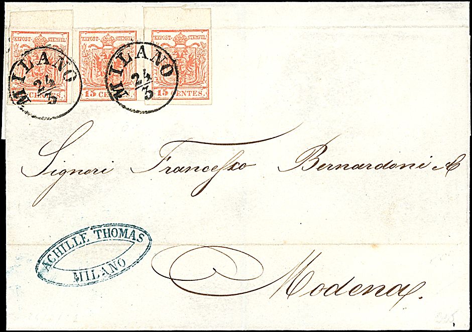1854 - 15 c. rosso vermiglio (20) Tre val. SPL dei quali 2 con b.f. in alto su lettera da MILANO (24/3) a Modena