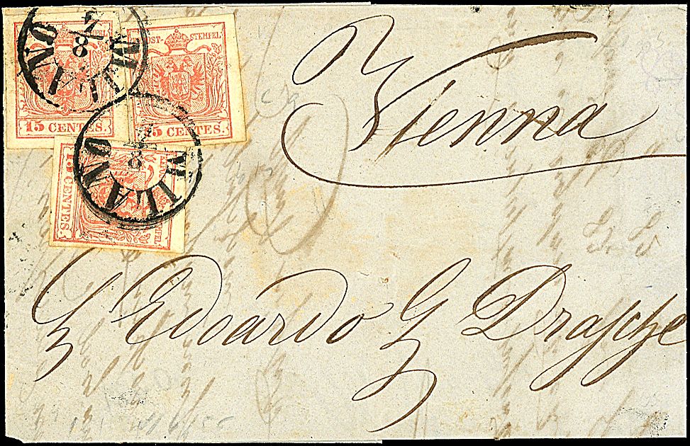 1854 - 15 c. rosso vermiglio (20) Tre val. SPL su lettera da MILANO (8/4) a Vienna