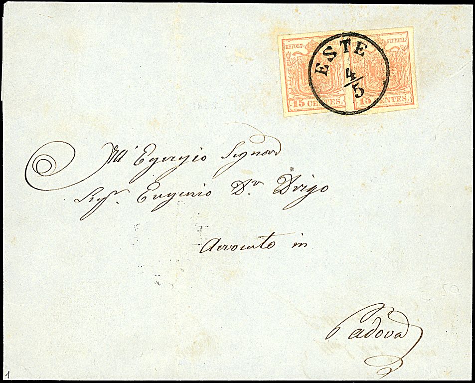1854 - 15 c. rosso vermiglio, carta a macchina (20a) in coppia SPL su lettera da ESTE (4/5) a Padova - Qualità lusso