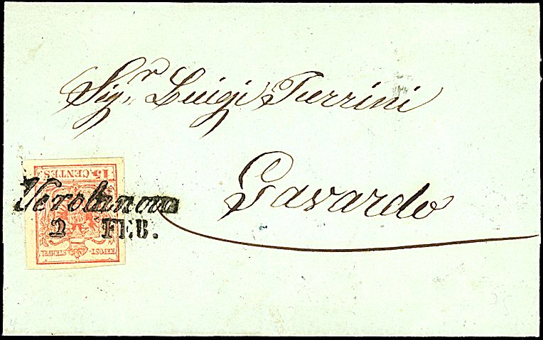1854 - 15 c. rosa vermiglio, carta a macchina (20c) SPL su lettera da VEROLANOVA (2 FEB - p. 4) a Gavardo