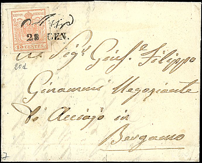1854 - 15 c. rosa salmone, carta a macchina (20d) SPL su lettera da ASSO (28 GEN - p. 7) a Bergamo (932,00)
