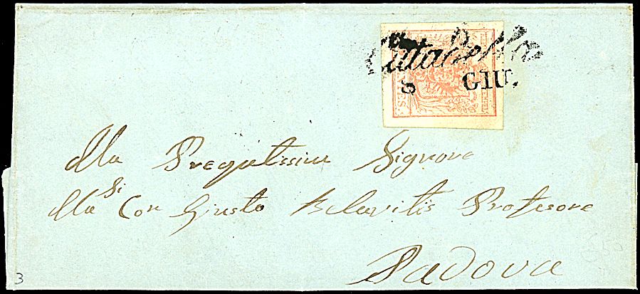 1854 - 20 c. rosa salmone, carta a macchina (20d) SPL su lettera da CITTADELLA (8 GIU - p. 3) a Padova
