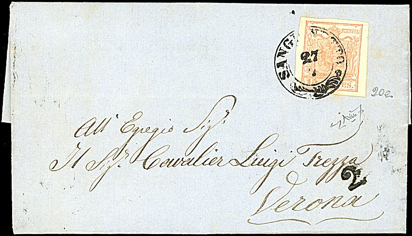 1854 - 15 c. rosa chiaro, carta a macchina (20e) SPL su lettera da SANGUINETTO (27/7 - p. 10) a Verona - Cert. Avanzo (3.080,00)