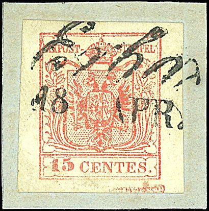 1854 - 15 c. rosso vermiglio, carta a macchina con spazio tipografico (20g) SPL e con grandimargini annullato ERBA (p. 6) Non comune