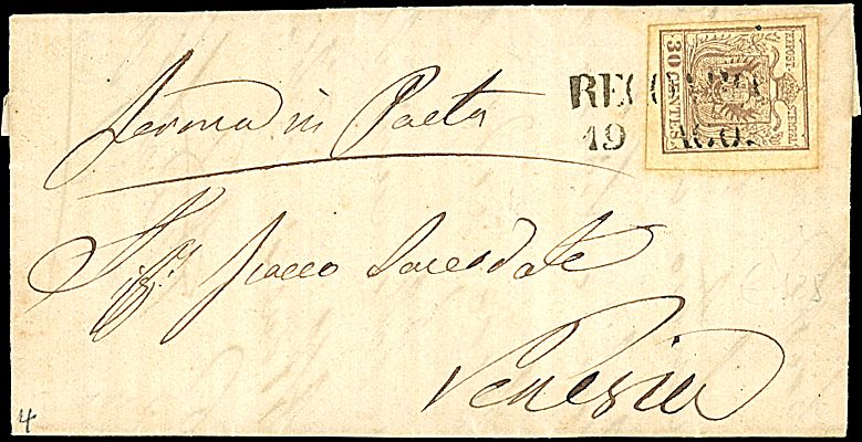 1855 - 30 c. bruno, carta a macchina (21b) SPL su lettera da RECOARO (19 AGO - p. 4) a Brescia