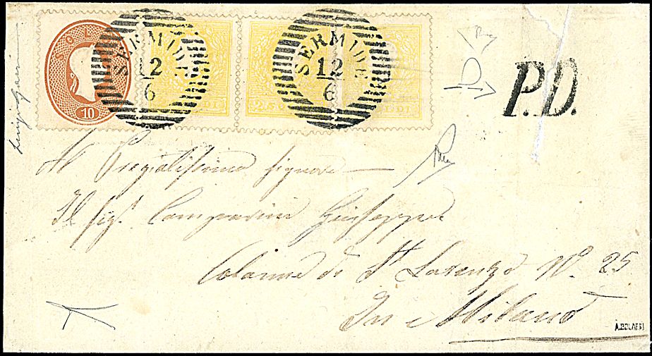 1859 - 2 s. giallo,II tipo (28) in coppia + 1 singolo + 10 s. bruno mattone (34) in splendida affrancatura bicolore su lettera da Sermide (12/6) a Milano - Cert. E. Diena per esteso + cert. Manzoni