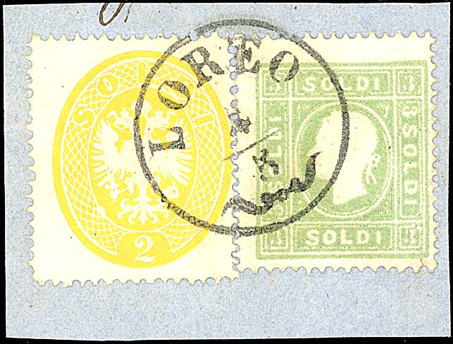 1862 - 3 s. verde giallo (35) + 2 s. giallo, dent. 14 (36) SPL su frammento annullato LOREO