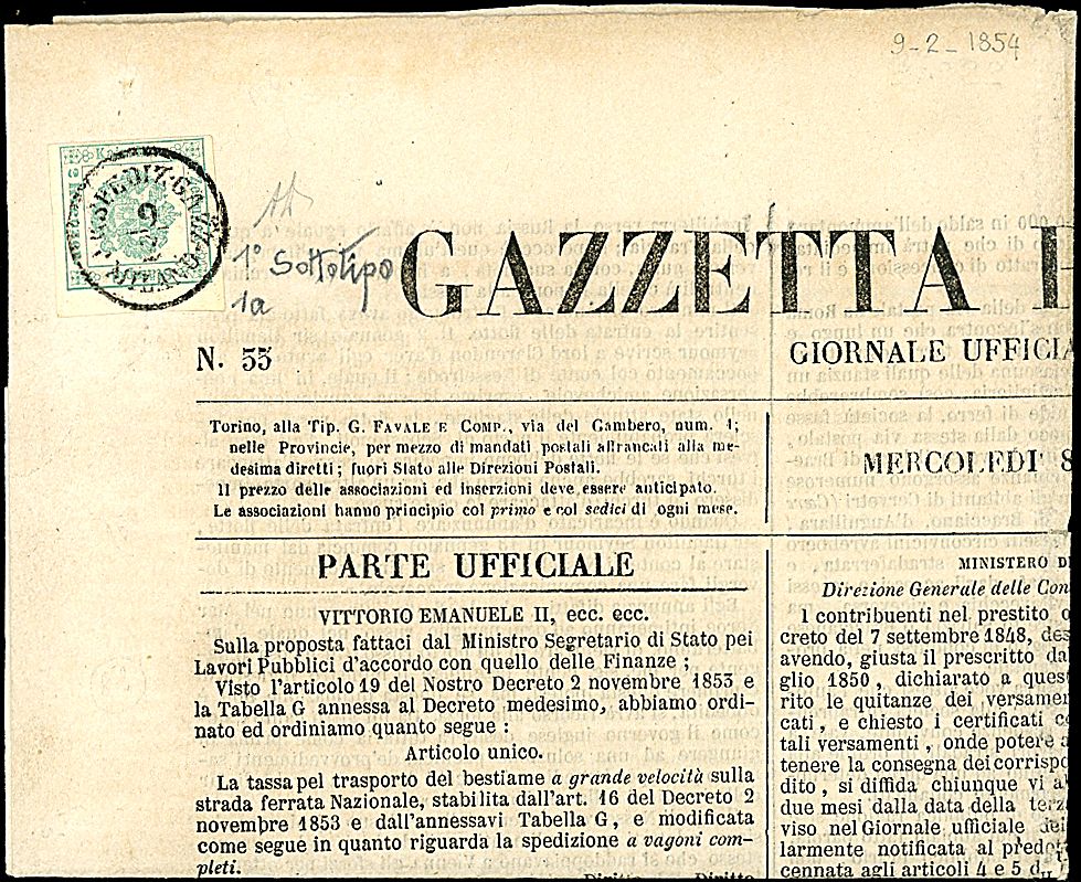 1853 - 2 kr. verde grigio, 1° sottotipo (1a) SPL su Gazzetta Piemontese annullata Milano (9/3/54) - Sigla AD (975,00)