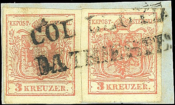 1854 - 3 k. rosso in coppia annullato COL LLOYD DA TRIESTE (p. 5) Interessante
