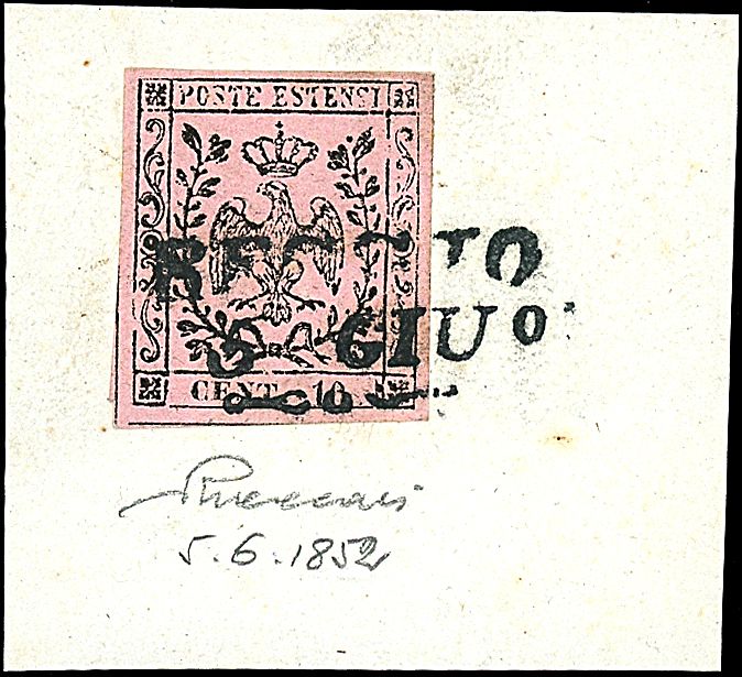 1852 - 10 c. rosa vivo (2a) SPL, annullato REGGIO 5 GIU - 5° giorno d'uso - Cert. Vaccari