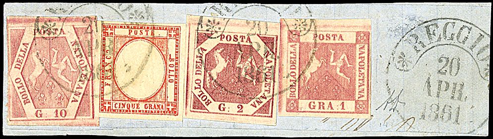 1861 - 1 gr. rosa carminio (4) + 2 gr. rosa brunastro (7) + 10 gr. carminio rosa (11) + porovince napoletane 5 gr. rosso carminio (21) Splendida affrancatura mista quadricolore su frammento - Rarissima - Cert. Landmans