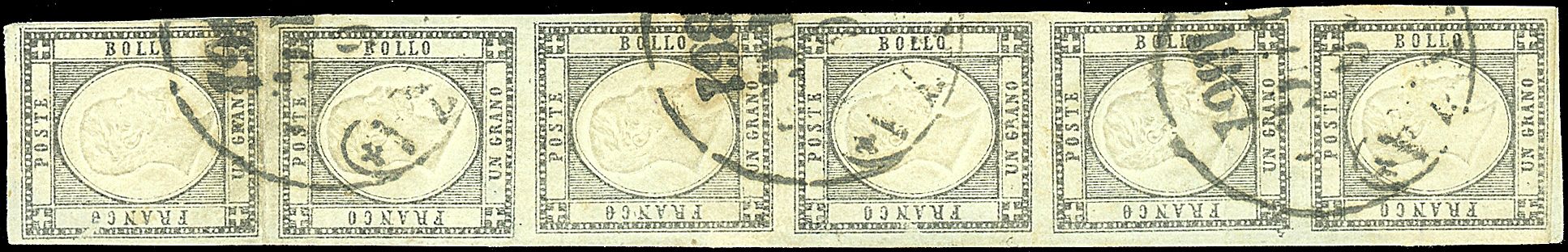 1861 - 1 gr. grigio nerastro (19a) in striscia verticale di 6 con grandi margini - Alcune pieghe orizzontali - Rarissima! - Cert. ED