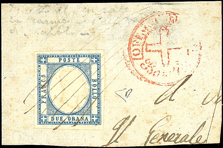 1861 - 2 gr. azzurro chiaro (20) SPL con annullo a penna + OFF. G. DI ARRIVO / Bonifica (p. R3) Rarissimo - Cert. Avanzo + sigla ED (7.500,00)