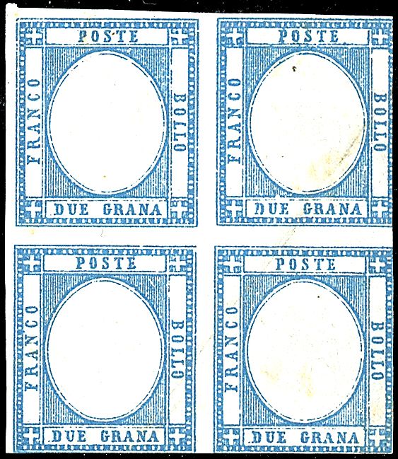 1861 - 2 gr. azzurro chiaro, in coppia di cui uno senza effigie (20i) in quartina di bell'aspetto ma difettosa - Rara! - cert. Manzoni (15.000,00)