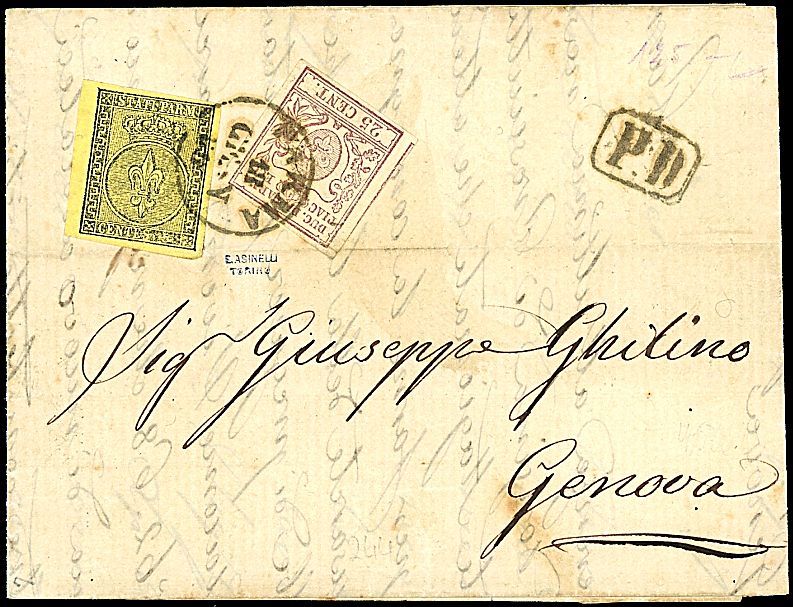 18590 - 5 c. giallo arancio (1) + 25 c. bruno lilla (10) SPL su lettera da PARMA 18 GEN 59 a Genova - Non comune! - Timbrino Asinelli (4.750,00)