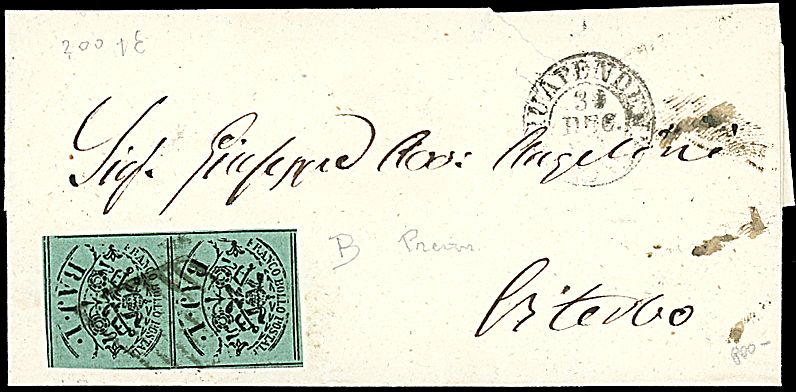 1852 - 1 b. verde scuro (2B) in coppia su lettera da Acquapendende (31/12) a Viterbo (825,00)