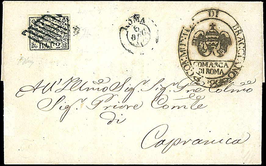 1852 - 2 b. bianco verdastro, con varietà tiara spezzata (3Af) SPL su lettera da Bracciano a Capranica - Sigle AD + Oliva (225,00)
