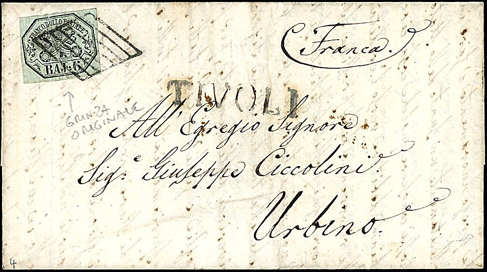 1852 - 6 b. grigio verdastro (7) SPL su lettera da TIVOLI ad Urbino