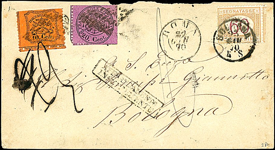 1870 - 10 c. arancio vermiglio arancio (26) + 20 c. solferino (28) Entrambi rifilati con le forbici su lettera da Roma (22/1/70) a Bologna dove fu tassata per 60 c. - Interessante