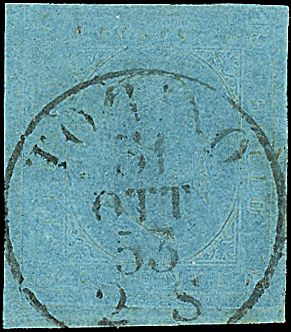 1853 - 20 c. azzurro (5) SPL - Sigle AD + Sorani (450,00)